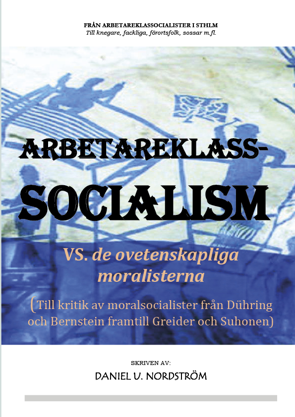 Arbetareklass-socialism vs. de ovetenskapliga moralisterna Författare: Daniel U. Nordström VARFÖR KÄNNS DET IDAG som att socialdemokratin inte har en framtid längre? Varför verkar det som att Socialdemokraterna skäms över sina egna arbetarväljare? Varför talar de enbart om socialism i högtidstal? Varför alla inre konflikter? Den här boken försöker svara på dessa frågor. Läsaren får en genomgång i hur socialdemokratin tänkte om sig själv när den grundades. Om alla grenar som har växt ut på dess idépolitiska stam. Vad den tänker om sig själv idag och varför! Boken skildrar socialdemokratin som kluven i två delar från allra första början: en rörelsebyggande tradition underifrån; en ”statsmannasocialism” (mot denna) ovanifrån. Nordström vill med denna bok överkomma socialdemokratin, genom att först behärska den! Först därefter kan arbetarrörelsen gå vidare... ”[...] i huvudsak så är relationen mellan SAP och arbetarklassen, statsmäns till ett passivt klientel. Byråkratin använder facket som försäkringsbolag, advokatbyrå; politiker använder SAP som ett företag där man betalar med sina röster förvälfärden och social trygghet. Allting som stör det mönstret är för Greider-Suhonen & Cos syfte något omoraliskt.” ”Vänstersocialdemokratin är idag en traditionalistisk moral, ytligt utsmyckad med nymodiga delteorier om samhället [...D]römmen om att gå tillbaka till socialdemokratins glansdagar, är på alla plan ett förlorande spår. Istället behövs en vetenskapligt grundad arbetareklasssocialism.” ”Vi luras inte att normer, i ett klassamhälle, har allmänmänsklig mening, utan, för oss är de rent ’tekniska instruktioner’ till att uppnå våra bestämda syften. De är klassnormer, satser i en verktygslåda, som alla kan bytas ut om de bara tar oss från A till B, inte A till Ö.”